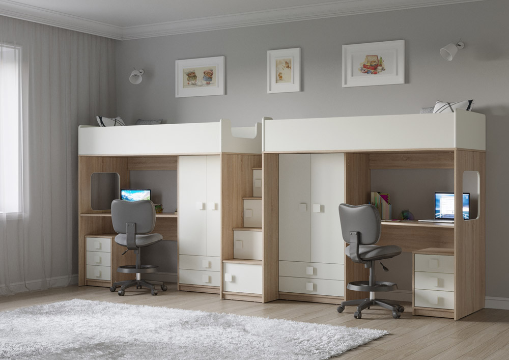 Две кровати, два шкафа, две рабочих зоны с тумбами – одна лестница. Идеальный вариант для двоих детей!