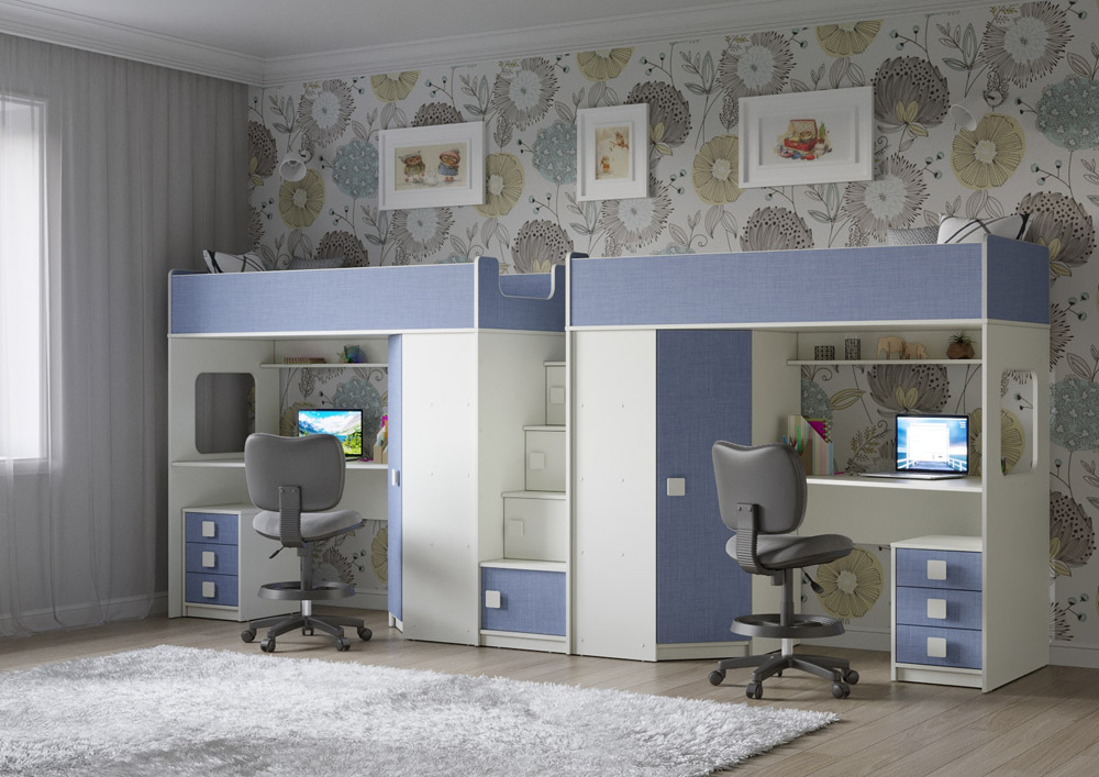 Под спальным местом для каждого ребенка располагается рабочее место с встроенным столом и тумбой.