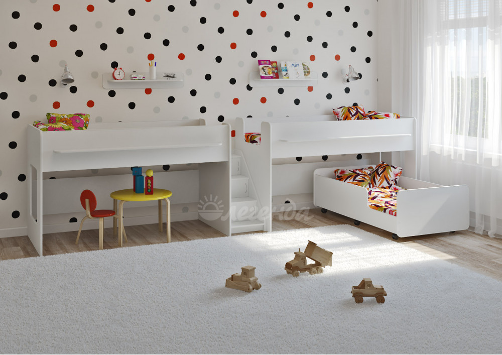 Практичные белые полочки Л-01 над каждой кроватью помогут организовать хранение полезных мелочей Вашего ребенка.